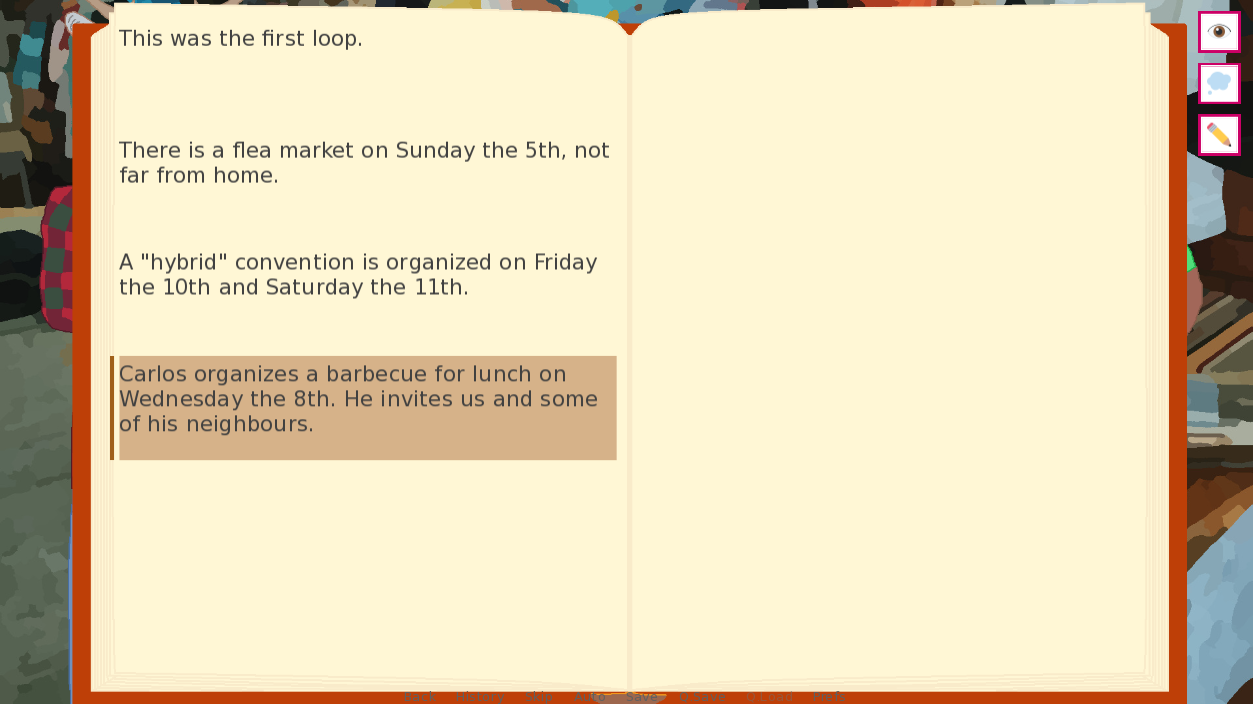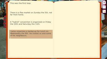 In this puzzle furry visual novel, you embark in a time loop to pair up your targets. Note information about what happens, or will happen, and use your foreknowledge to make the right decisions. The mission is gravely important, but the process is pleasing: you learn more about the people around you, make new friends, you think about romance... This is a nice way to get back to life after what happened to your other mom...